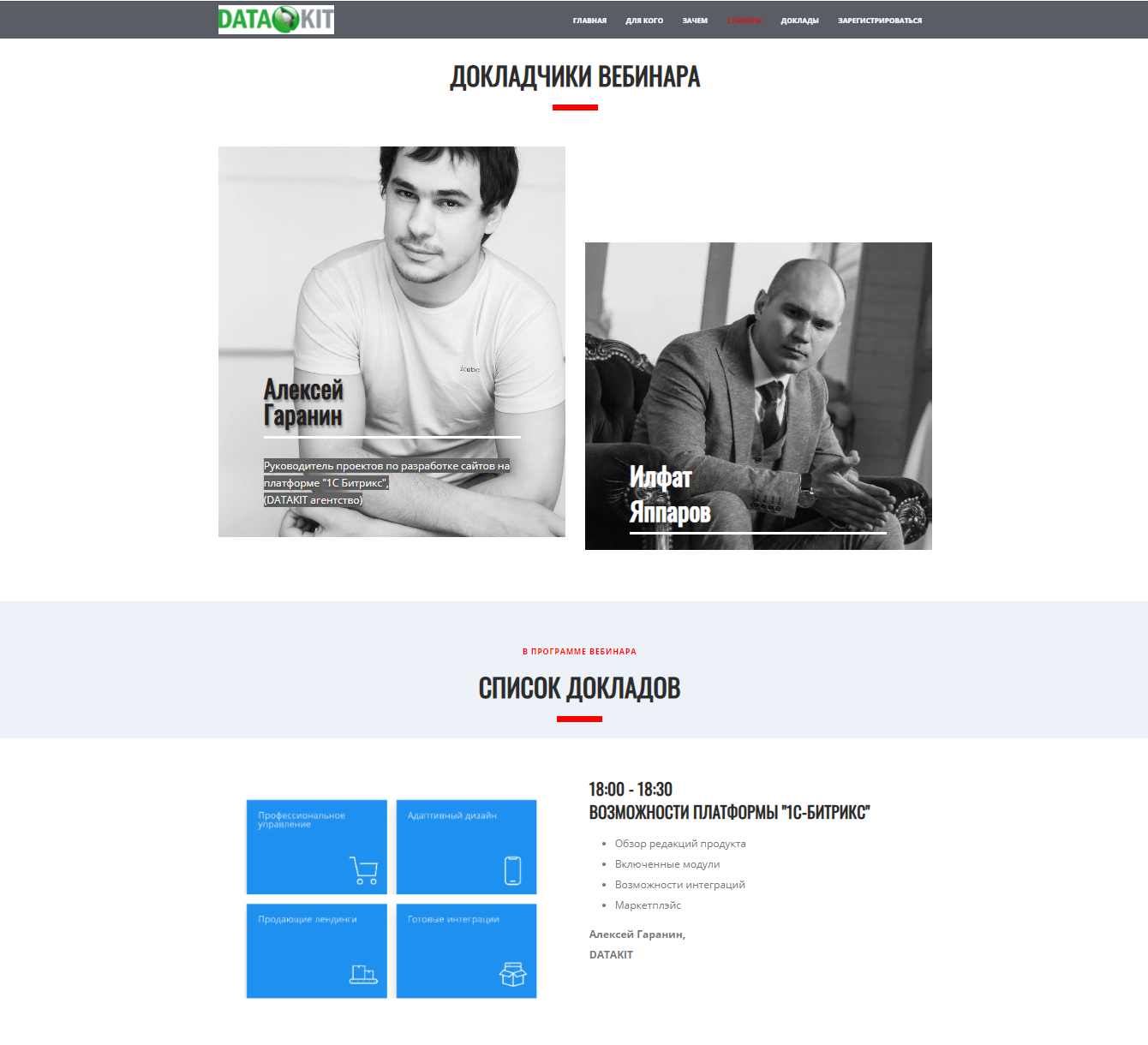 На главной странице – название мероприятия, время проведения и упоминание о бесплатной регистрации. На втором и третьем экранах – информация о плане вебинара, названия докладов и имена докладчиков.