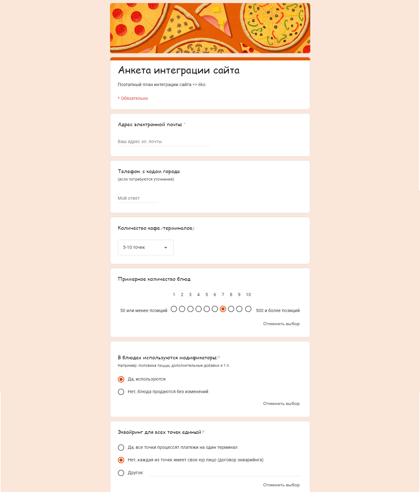 Подготовили форму регистрации для заинтересованных пользователей. Мы должны были понять особенности аудитории, поэтому составили вопросы про количество терминалов и блюд, наличие модификаторов в блюдах и т.д.
