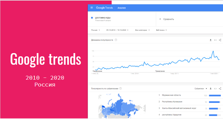 Основной блок – об интеграции сайта на Битрикс с системой IIko. В первом же слайде мы показали рост популярности категории «Доставка еды» в Google Trends,