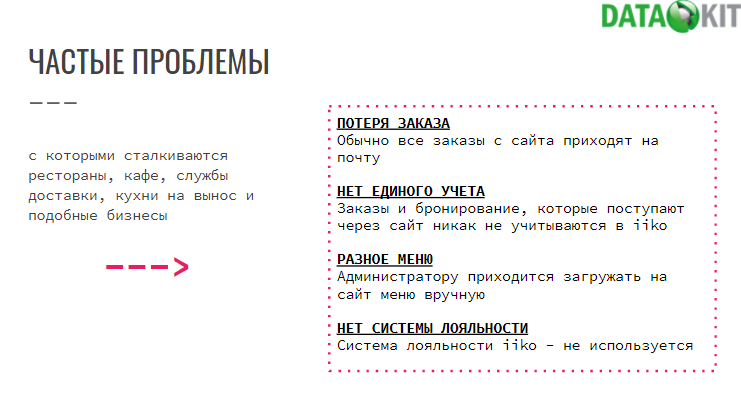 Рестораны, кафе, службы доставки и прочие подобные бизнесы часто сталкиваются с проблемами автоматизации процессов. Мы в ДатаКит работали со многими клиентами из сферы общепита, и не понаслышке знаем о потере товаров, отсутствии единого учета, проблемах с системой лояльности и других трудностях, тормозящих обслуживание и получение прибыли.