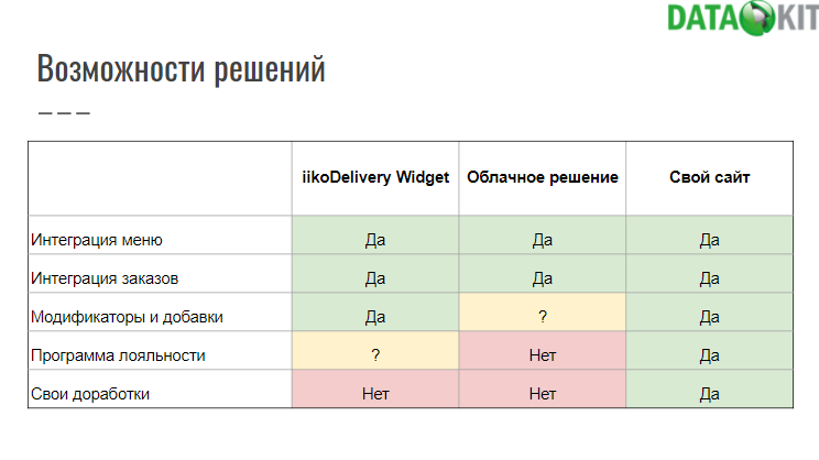 Таблица на третьем слайде показывает преимущество своего сайта с системой IIko перед виджетом IIko или облачными решениями вроде 2Gis или Яндекс.Еда. В виджете IIKO и облачных решениях нельзя применять свои наработки, а настройка программы лояльности с модификаторами остается под вопросом. Свой же сайт позволяет настраивать любые бизнес-процессы в любое время в любых вариациях.