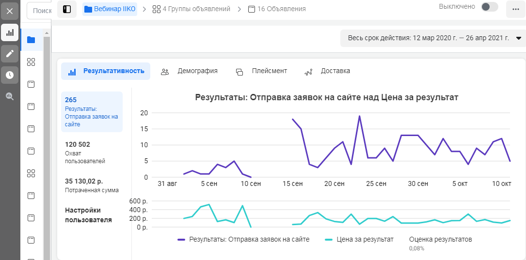 Рекламная кампания работала 1,5 месяца. Уже на старте мы поняли, что гипотеза об использовании нашей базы клиентов нерабочая. С нее шел очень небольшой трафик. Группа с похожими клиентами приносила нецелевые заявки. Чтобы не расходовать бюджет, мы отказались от этих кампаний и сосредоточились только на прямом и косвенном таргете на владельцах заведений общепита.