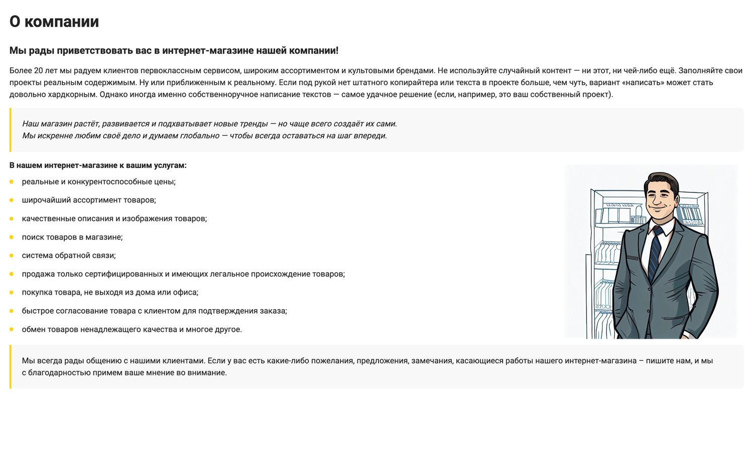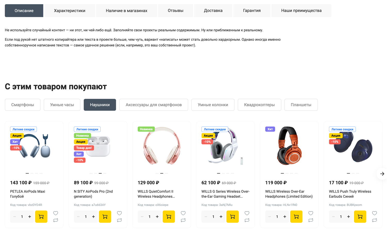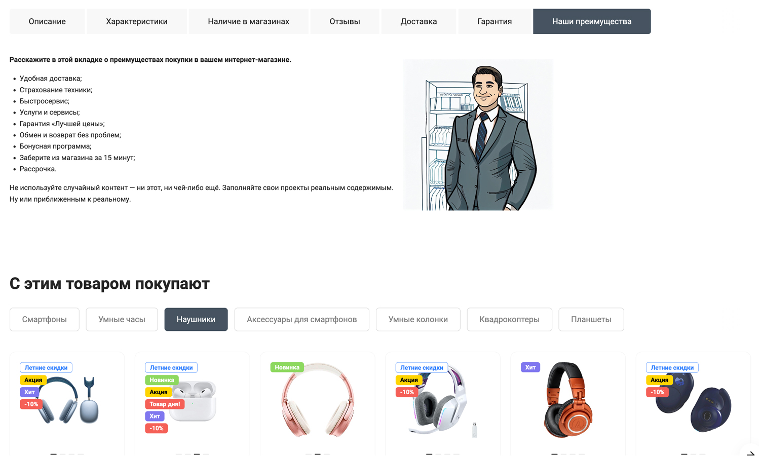 Используйте вкладку для информации о продуктах и их пользе для покупателей. Размещайте информацию, которая поможет пользователю разобраться и сориентироваться по свойствам товара.