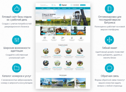 Аспро: Курорт — это профессиональное типовое решение для создания сайта базы отдыха, санатория или курорта. Готово к запуску прямо «из коробки»: после установки и первичной настройки сайта останется лишь рассказать о компании и разместить основную информацию о вариантах проживания и дополнительных услугах.