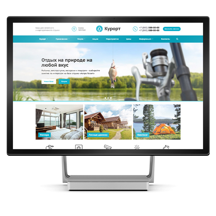 - развернутый раздел «Курорт» – для информации о базе отдыха, описания территории, отзывов клиентов.