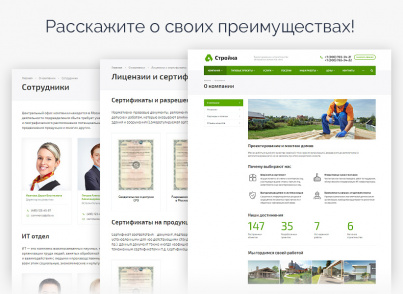 - развернутый раздел «О компании» – для информации о фирме и сотрудниках, технологиях строительства, лицензий, сертификатов и допусков СРО, списка партнеров, отзывов клиентов и реквизитов.