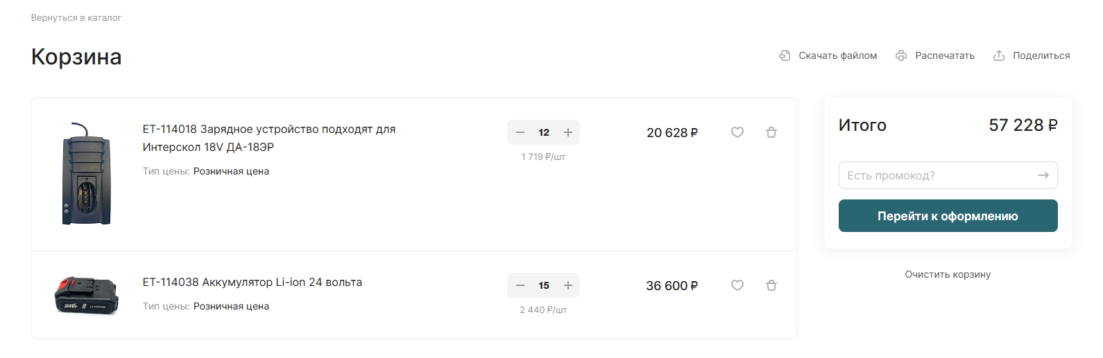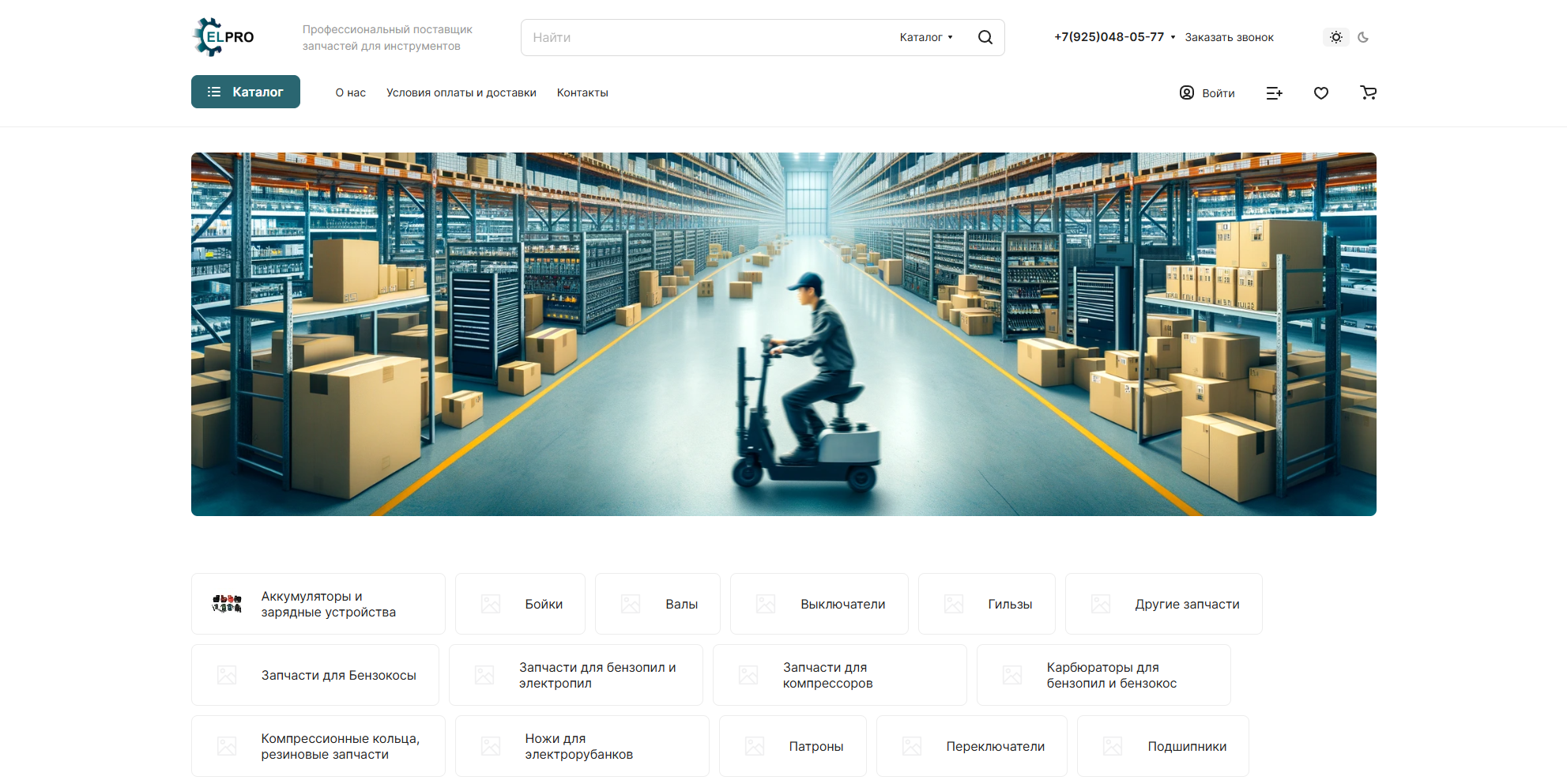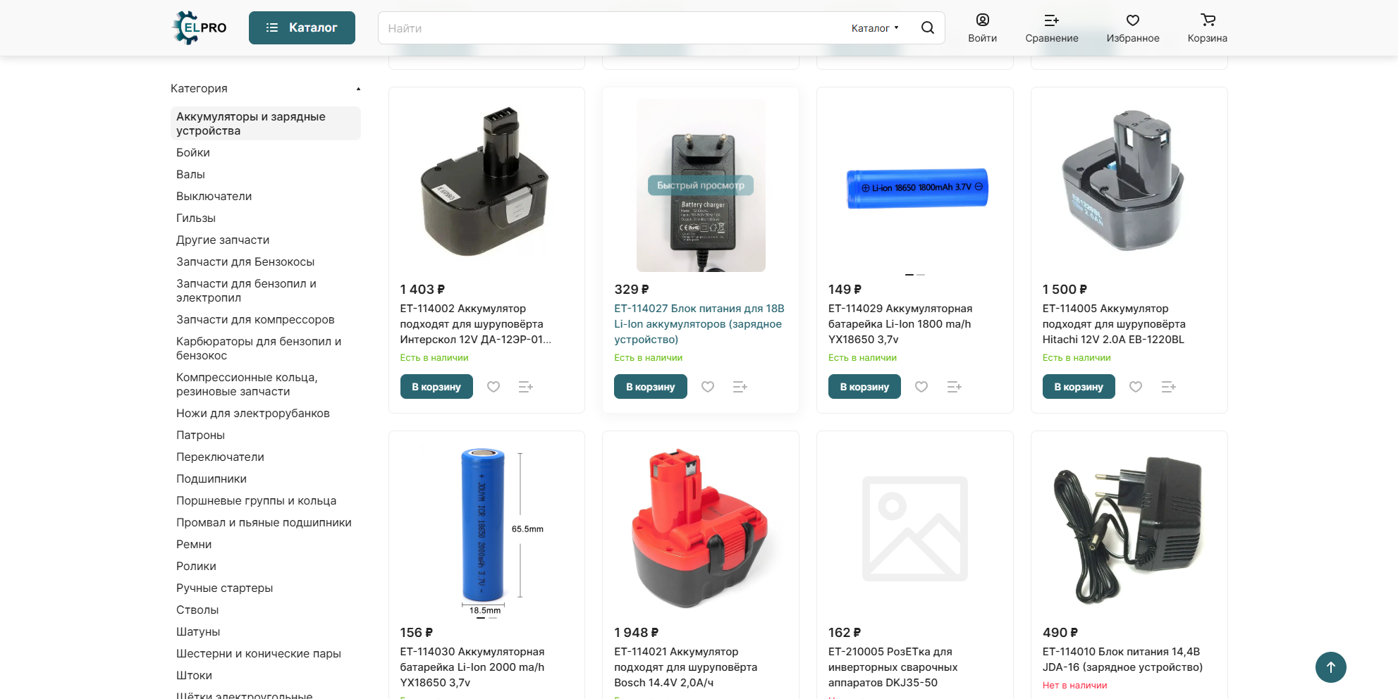 Каталог товаров: включает разнообразные категории запчастей, такие как аккумуляторы, бойки, валы, карбюраторы и другие комплектующие для различных инструментов.
