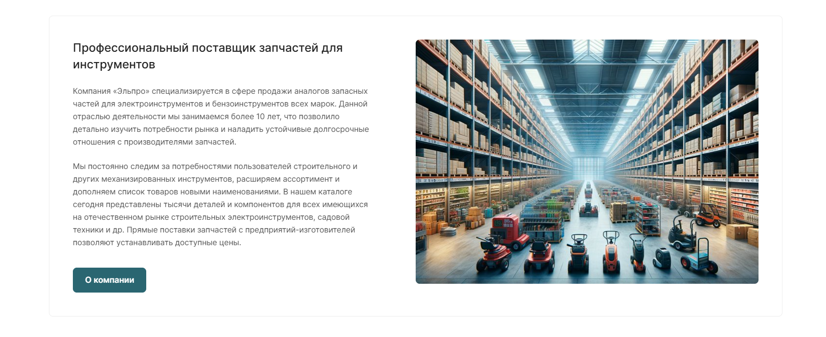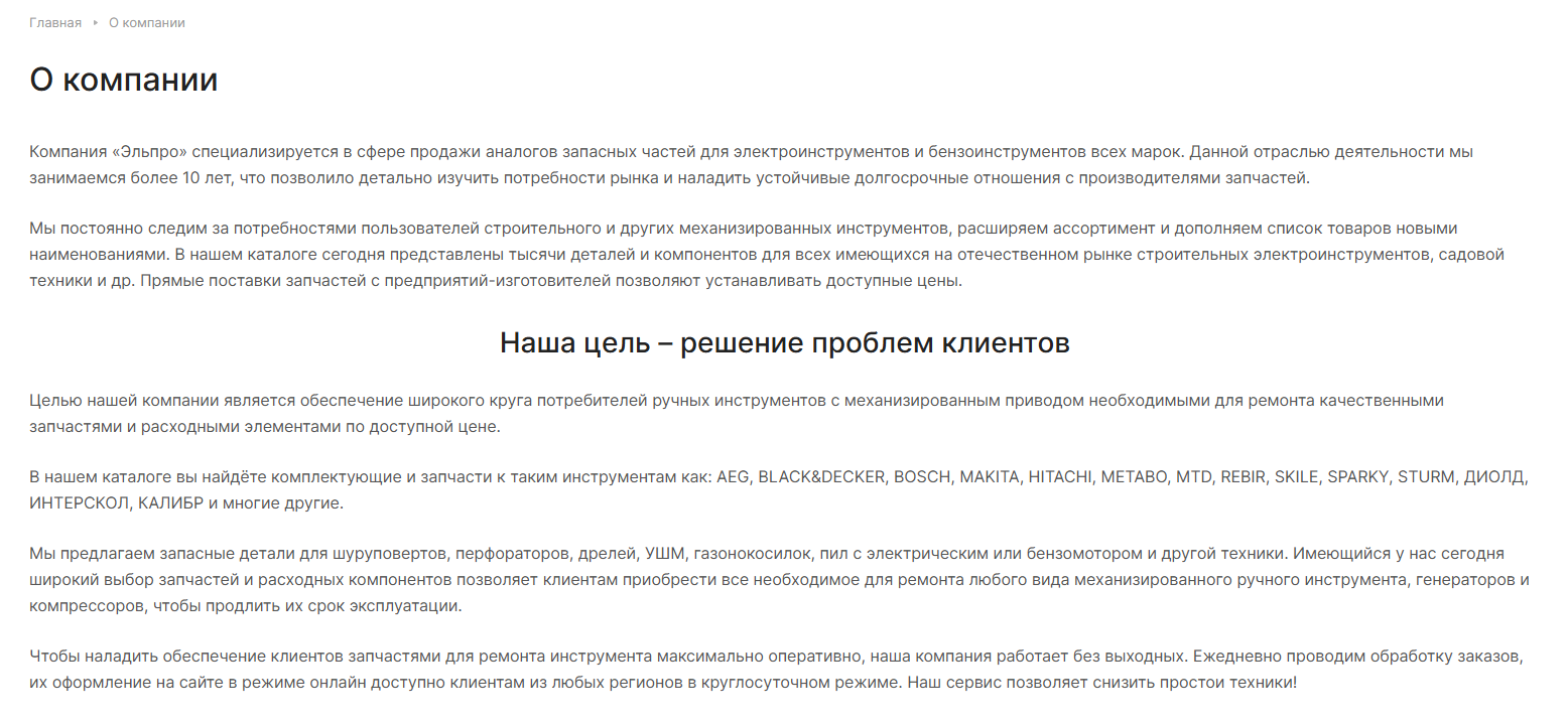 Компания «Эльпро» специализируется на продаже аналогов запасных частей для электро- и бензоинструментов всех марок. Уже более 10 лет она успешно работает на рынке, детально изучая потребности клиентов и устанавливая прочные связи с производителями запчастей. Основная аудитория компании — пользователи строительных и садовых инструментов, которым необходимы качественные и доступные запчасти. «Эльпро» предлагает тысячи наименований деталей и компонентов для различных инструментов, обеспечивая прямые поставки от производителей и конкурентоспособные цены.