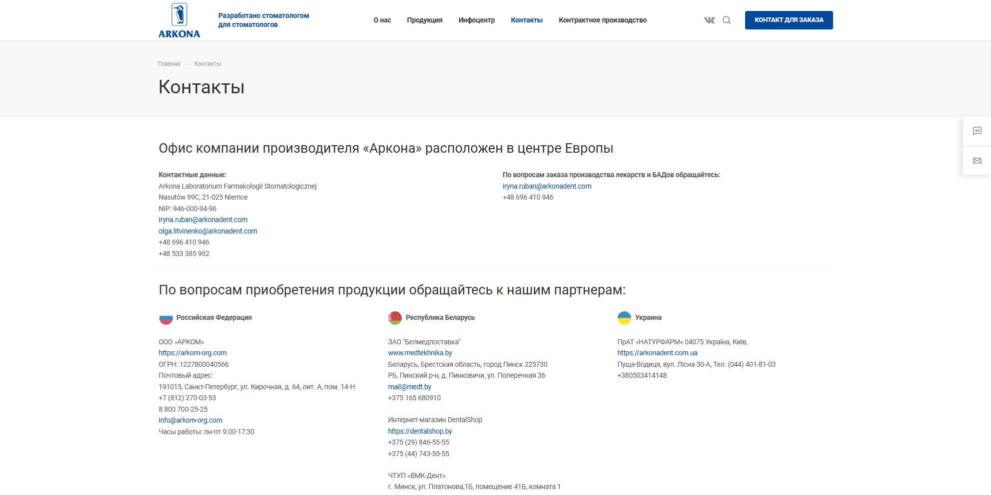 Компания «АрконаДент» является официальным представителем польской фармацевтической компании ARKONA в России. Специализируется на поставках высококачественных стоматологических материалов для профессионального использования. Целевая аудитория — стоматологические клиники, частные практикующие стоматологи и дистрибьюторы медицинских материалов. Компания стремится предоставлять инновационные и надежные решения для стоматологической практики, обеспечивая высокие стандарты качества и сервиса.