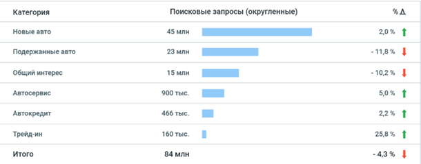 - «подержанные авто» - 12 рубля. Интерес к категории сильно упал.