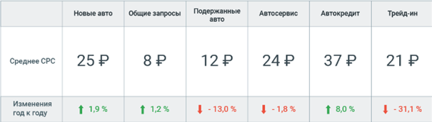 Отслеживалось снижение CTR во всех автокатегориях. Исключение – трейд-ин (+2%). Цена за клик выросла в категориях: