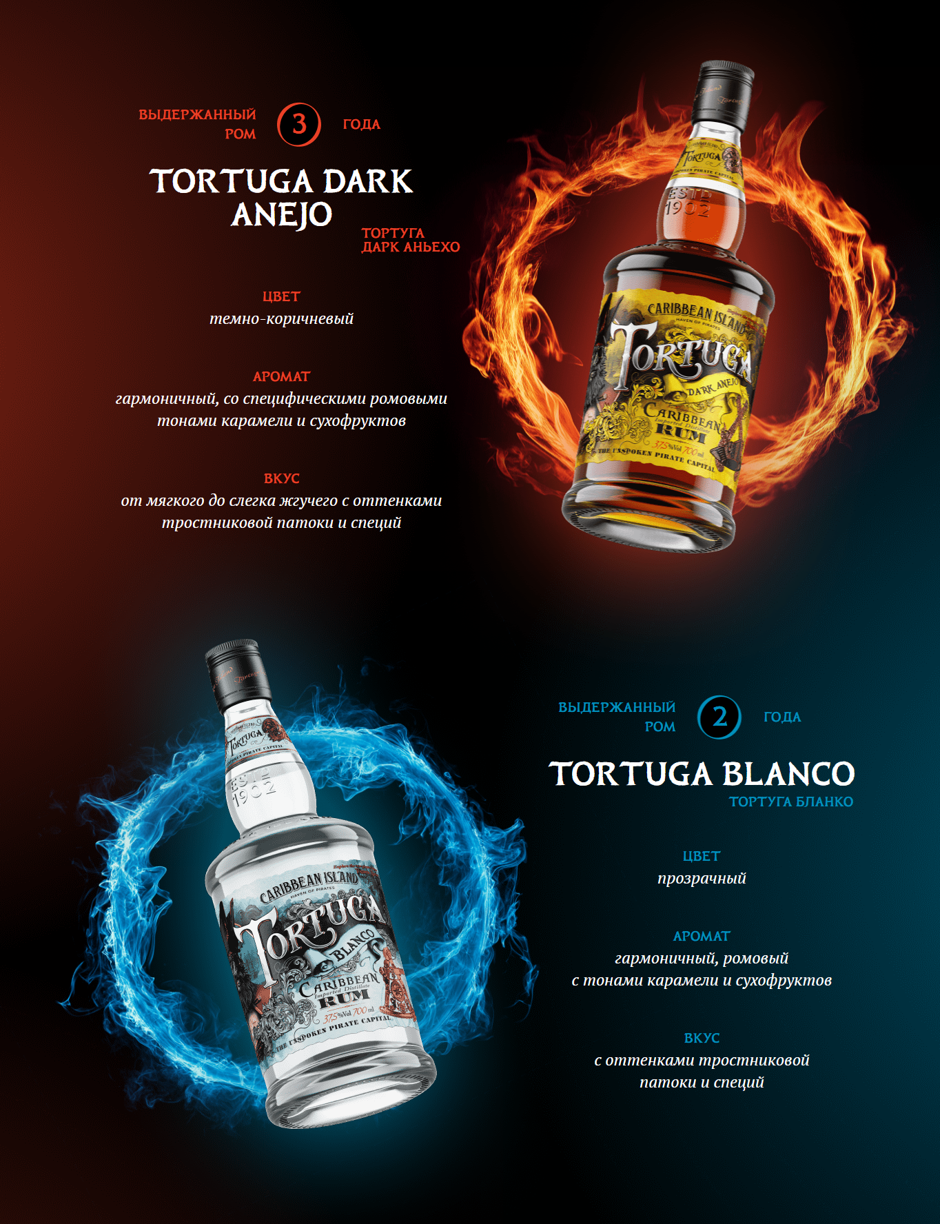 Компания «TORTUGA» специализируется на производстве выдержанного рома, дистиллят которого производится и выдерживается на Карибских островах в бочках из-под бурбона из американского дуба среднего обжига. Основное сырье — тростниковый сахар. Целевая аудитория компании — ценители качественного рома и любители коктейлей на его основе. Компания стремится предоставить своим клиентам аутентичный карибский вкус и атмосферу, воплощенные в их продукции.